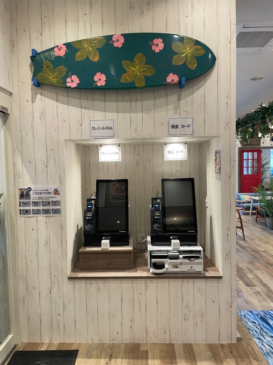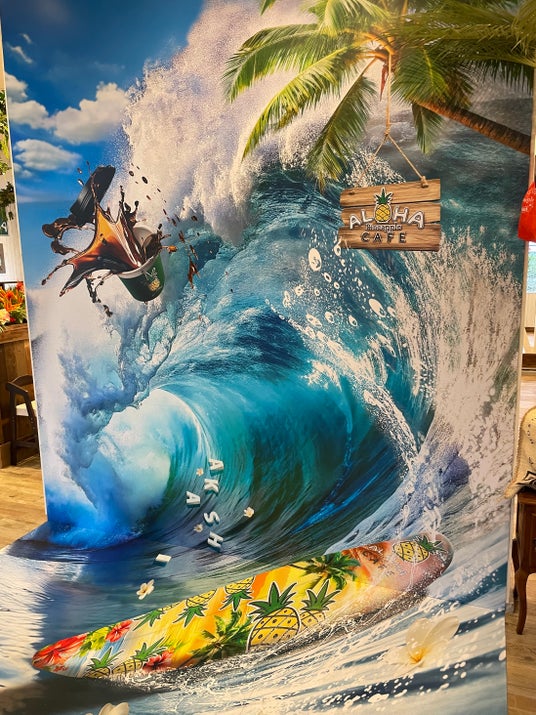 店内入ってすぐにアートが!サーフボードに乗って写真を撮ろう!