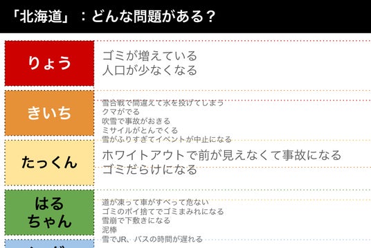 子どもたちからは、大雪、路面凍結、雪かきの労力など「冬の大変さ」にまつわるもの、熊や鹿の出没、海産物の変化など気候変動にまつわるもの、子どもの遊べる場所の少なさ、高齢者の事故など少子高齢化にまつわるものなど、様々な意見が上がりました。また、実際に北海道の企業が行っている地元貢献のための活動を知り、課題とその解決のためのアプローチ手法を学びました。