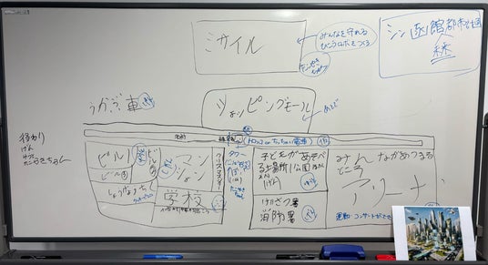北海道の移動と人口問題の解決方法を考える函館チームのアイデアを書き出したホワイトボード