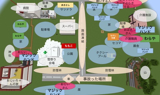 スライドで制作した設計図。交通事故の問題を、実際に交通事故の現場を表現することで伝えようとしている。