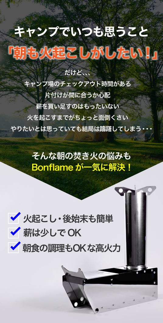 【割引クーポン先行配布中】キャンプの朝が変わる!朝専用!時短焚き火スタイルファイヤーギア【Bonflame】が国内クラウドファンディングCAMPFIREにて4/18(金)にプロジェクト開始!