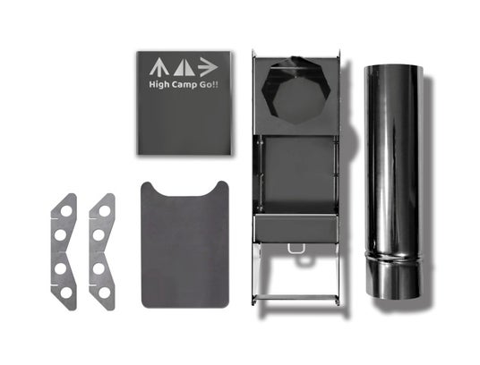 パーツ構成:ボディ×1, 煙突×1, 天板×1, 投入口プレート×1,五徳プレート×2材質:ステンレス鋼