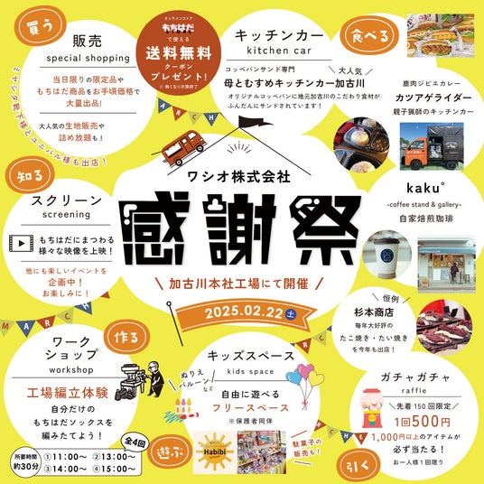 このたび、日頃の感謝を込めて、2025年2月22日(土)に加古川の本社工場にて、年に一度の感謝祭を開催いたします!
