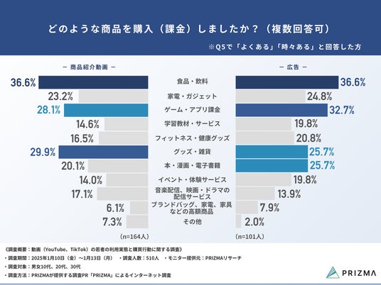 広告では『食品・飲料(36.6%)』が最も多く、『ゲーム・アプリ課金(32.7%)』『グッズ・雑貨(25.7%)』が上位にランクインしました。