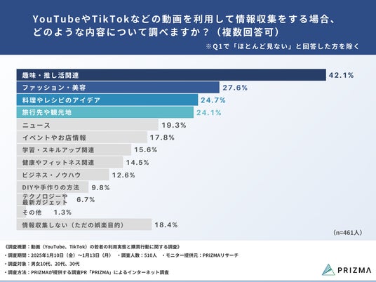 さらに、「Q4. YouTubeやTikTokなどの動画を利用して情報収集をする場合、どのような内容について調べますか?」と質問したところ、『趣味・推し活関連(42.1%)』が最も多く、『ファッション・美容(27.6%)』『料理やレシピのアイデア(24.7%)』『旅行先や観光地(24.1%)』が続きました。