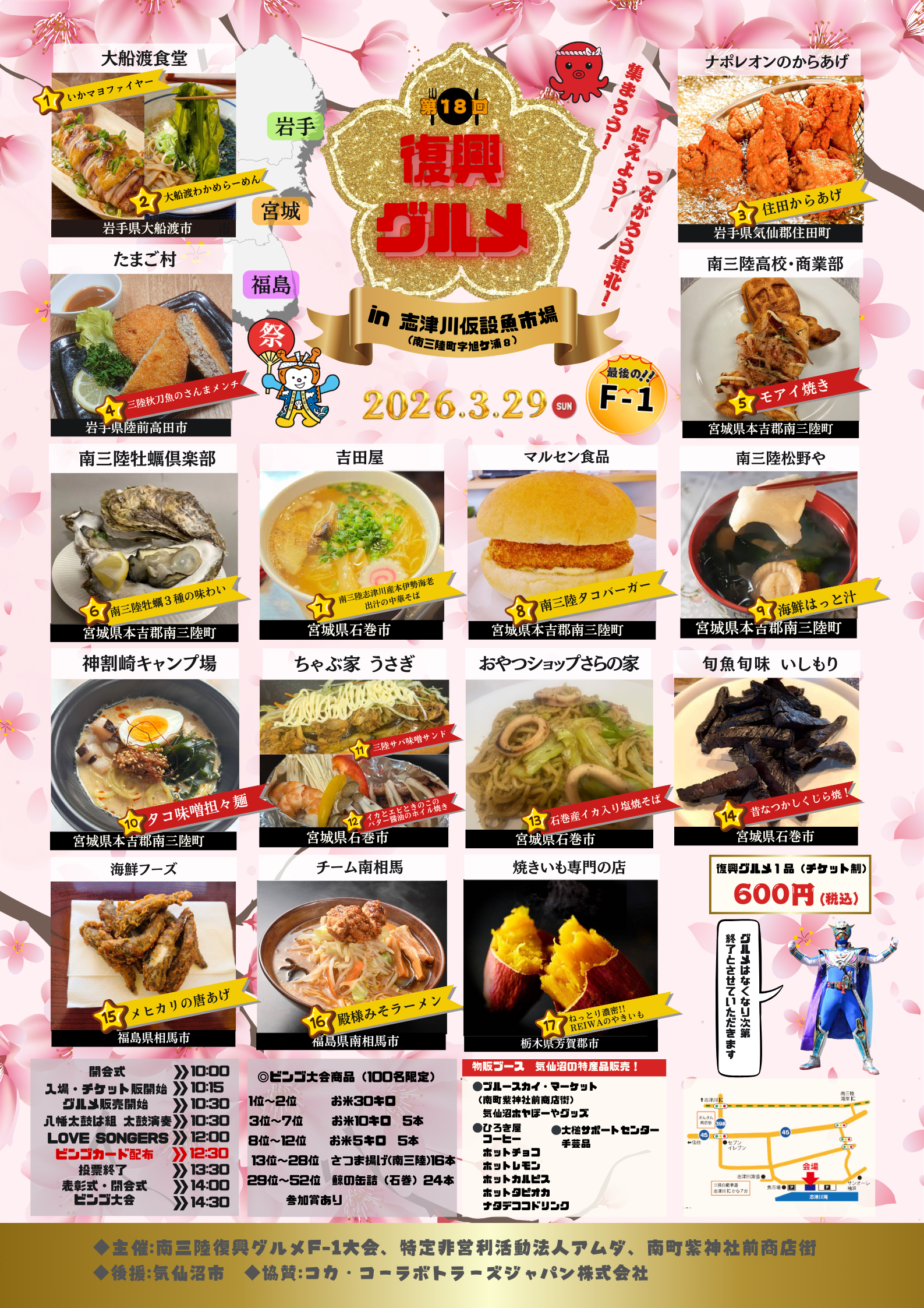 第18回『復興グルメ F-1大会』~集まろう!伝えよう!つながろう東北!~ - 日時:2026年3月29日(日)10:00~14:30 - 場所:志津川仮設魚市場(宮城県本吉郡南三陸町志津川字旭ケ浦8) - 当日チケット購入制(グルメ1品600円/税込) ▽イベントの詳細はこちら https://www.m-kankou.jp/event/263828.html/ 【内容】 ・ご当地グルメ販売 ・来場者投票によるグランプリ決定 ・太鼓演奏、ライブステージ ・ビンゴ大会(お米30kgなどが当たる) ・物販ブース(気仙沼の特産品販売) 【タイムスケジュール(予定)】 10:00 開会式 10:15 入場・チケット販売開始 10:30 グルメ販売開始 10:30 八幡太鼓は組 太鼓演奏 12:00 LOVE SONGERS ライブ 12:30 ビンゴカード配布 13:30 投票終了 14:00 表彰式・閉会式 14:30 ビンゴ大会 13年という月日。仮設商店街から始まったこの大会が、ついに南三陸でフィナーレを迎えると思うと胸が熱くなりますね。 単なるグルメイベントではなく、東北の事業者の皆さんと、それを支えてきたファンの皆さんの「同窓会」のような温かい一日になりそうです。 お米30kgを狙いつつ(!)、最後のグランプリがどのメニューに輝くのか、その目で見届けに行きませんか?■主催・問い合わせ