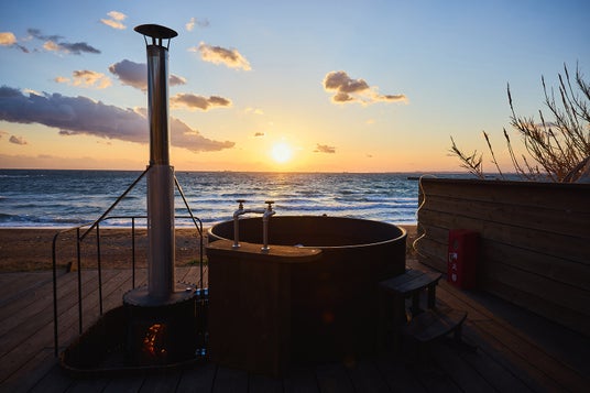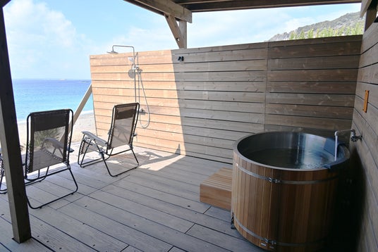 共用部にはクーリング後の冷えた体にうれしい大人5~6名でご利用いただけるアウトドアバスをご用意しました。視界を遮るものが一切ない海の“最前列”で楽しむ贅沢な佇まいのなか、水平線に浮かぶ富士山のシルエットにうっとりと目を遊ばせる安らかなひとときをお楽しみください。
