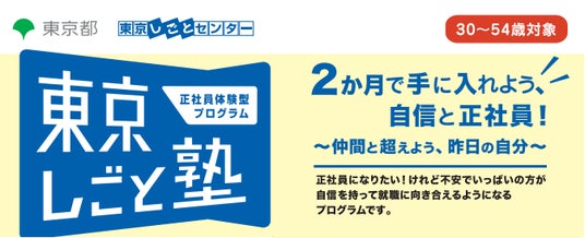 公益財団法人東京しごと財団(所在地:東京都千代田区)では、都内で正社員就職を目指す30~54歳の求職者を対象に、正社員体験型プログラム「東京しごと塾」を実施しています。キャリアデザインのためのプログラムを受講後、企業で働くことを想定した2か月間の職務実習を通じて正社員就職を目指します。