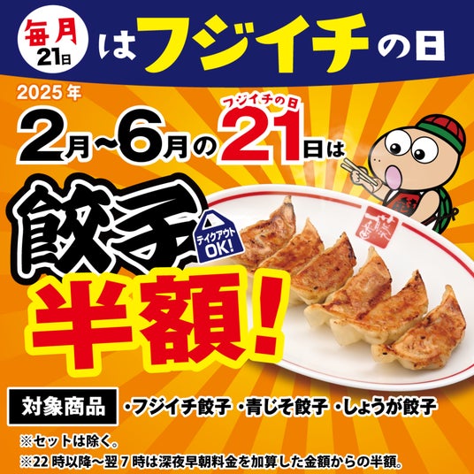 毎月21日はフジイチの日!第一弾は餃子半額。第二弾については7月上旬頃発表予定!