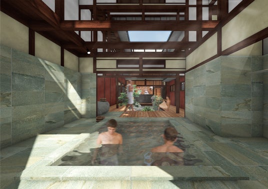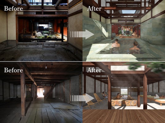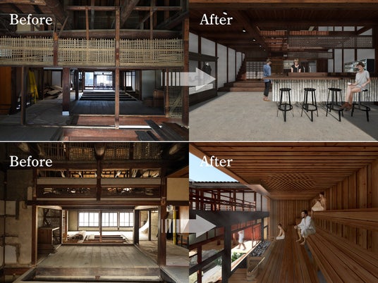 KIWAMI SAUNA II 外気浴パース  外気浴スペースは、7つの異なるテーマを持つととのいスペースをご用意しました。フラットな畳や中庭を望む縁側デッキなど、それぞれの空間に特徴があり、自分だけの「きわまり方」を探し出す特別な体験を味わえます。さらに、築150年の蔵をリノベーションした湯風呂エリアも設置し、温冷交代浴も可能。新たな”きわまる”体験を楽しんでいただけます。 ※詳しくは、クラファンページをご覧ください。  上:エントランス/下:サウナ室