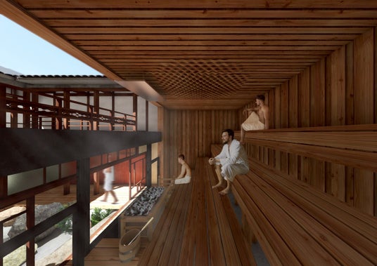 ◼️メインサウナ KIWAMI SAUNA II サウナ室パース  サウナは、天井高4メートル、4段構成のタワーサウナです。中庭を望む大空間で、好きなだけセルフロウリュを楽しめる贅沢な設計に。高低差から、ロウリュする人と最上段に座る人の間で、「ロウリュしますか?」と自然な思いやりの会話が生まれる、そんな「空間の温かさ」もデザインしました。 ◼️水風呂