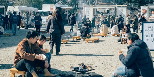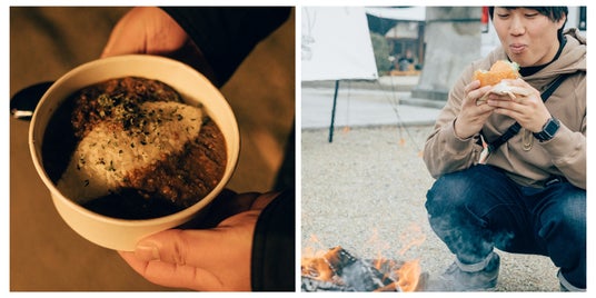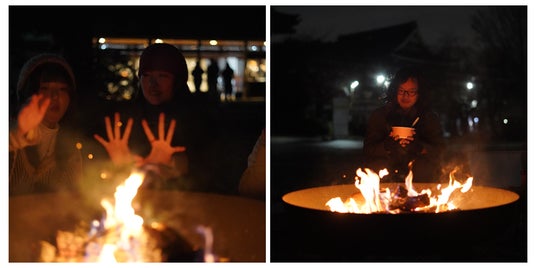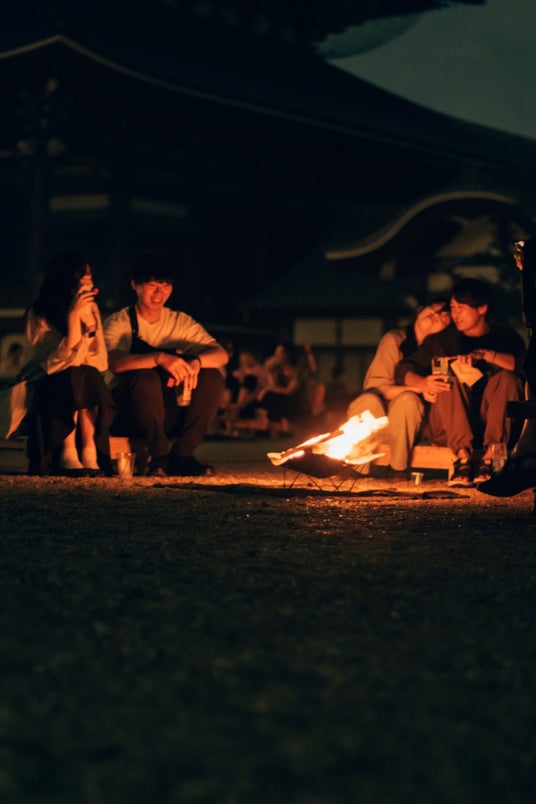 - - お寺の境内で焚き火を囲みながら、フードやドリンクを楽しむ