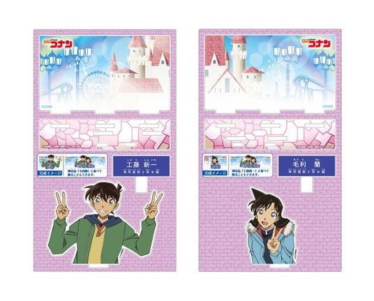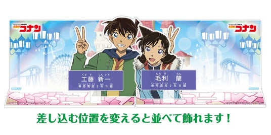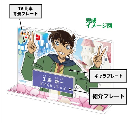 キャラクター紹介アクリルスタンドはTV比率の背景プレート、キャラクタープレート、紹介プレートの3つを台座に差し込んで組み立てると、キャラクター紹介をイメージしたアクリルスタンドが完成します。ラインナップは工藤新一、毛利蘭の全2種。キャラクタープレートと、紹介プレートの差し込む位置を変えると、2種を並べて飾ることもできます。