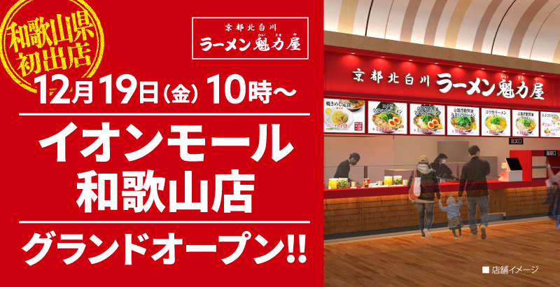 京都北白川ラーメン魁力屋をチェーン展開する株式会社魁力屋(https://corp.kairikiya.co.jp/本社:京都市中京区、代表取締役社長:藤田 宗、以下魁力屋)は、2025年12月19日(金)に「京都北白川 ラーメン魁力屋 イオンモール和歌山店」を和歌山県和歌山市にグランドオープンいたします。