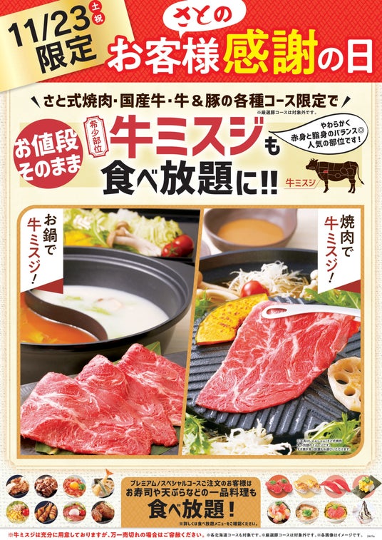 国内197店舗を展開する「和食さと」では、11月23日(土・祝)「勤労感謝の日」限定で、人気の焼肉/しゃぶしゃぶ/すき焼きの食べ放題コース「さと式焼肉/さとしゃぶ/さとすき」の各種コースで、牛肉の希少部位『ミスジ』も食べ放題になる『さとのお客様感謝の日』特別企画を開催します。この日限りのプレミアムデーですので、1年の労をねぎらう勤労感謝の日に、是非和食さとの食べ放題をお楽しみください。