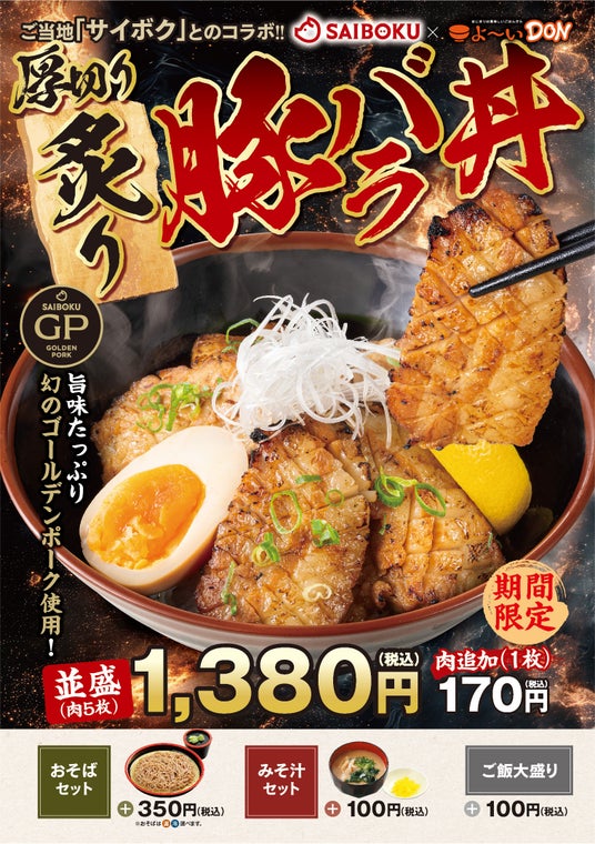 期間限定商品として、よ~いDONの「厚切り炙り豚バラ丼」が登場しており、並盛(肉5枚)は1,380円(税込)です。また、肉の追加は1枚ごとに170円(税込)です。さらに、当店のおすすめ商品である牛カルビ焼肉丼は960円(税込)で、お肉の増量は1.5倍で+470円(税込)、2倍で+940円(税込)となっております。
