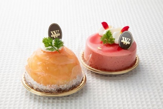 〈ヴィタメール〉 左:ペッシュ 税込864円 桃のジュレをクリームで包み、桃を飾りました。アーモンド生地が桃の味わいを引き立てます。 右:ラ・ドゥース 税込831円 桃の果肉入りのソースと桃のやさしい甘みが広が