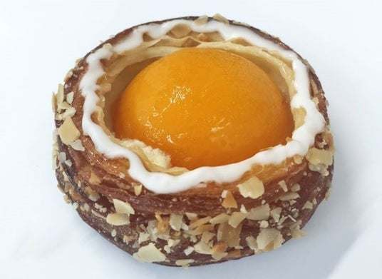 〈聖庵〉 ●地下2階 ピーチ&クリームチーズ 税込410円 サクサクとしたデニッシュ生地に、ピーチとクリームチーズのハーモニー。