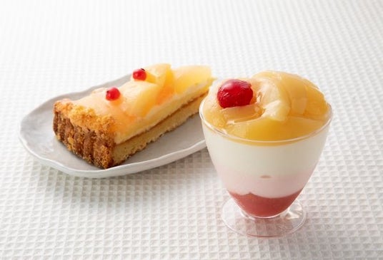 ードと甘い桃を乗せました。 右:ピーチメルバ 税込600円 桃のコンポートの下には2種のムースとベリーソースがイン。夏にぴったりのグラスデザート。
