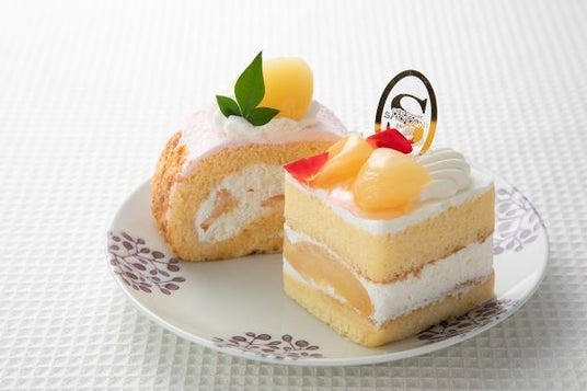 〈ケーキハウス ショウタニ〉 左:桃のロールケーキ 税込400円 ふわふわのスポンジで、甘さ控えめの生クリームとみずみずしい桃をひと巻きしました。 右:桃のショートケーキ 税込460円 上品な甘さの生クリームを使用したケーキに旬の桃を使用してすっきりとした味わいです。