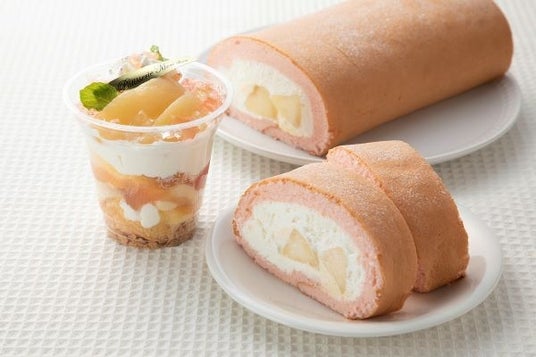 〈ベビーモンシェール〉 左:パルフェ・ピーチ 税込698円 ピーチのソースやゼリーに、フィアンティーヌや堂島クリームを重ね桃を飾ったパルフェ。 右:季節の堂島ロール 桃 (1本)税込2,160円 桃ペーストを混ぜ込んだピンクの生地に、手炊きカスタードと桃をひと巻きしました。