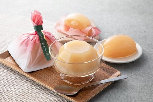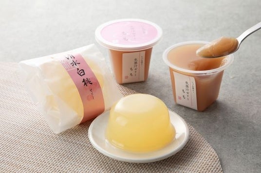 左〈福壽堂秀信〉清水白桃ゼリー 税込486円 輝くような岡山産清水白桃の果肉と果汁をブレンドした、香気ほとばしるゼリーです。 右〈小倉山荘〉いづみ流るる生果汁ゼリーもも 税込432円 国内産の濃縮果汁を使用した、まろやかな口あたりのももゼリー。