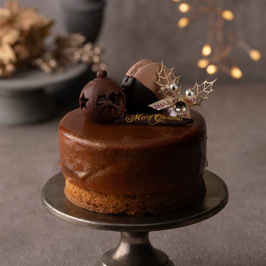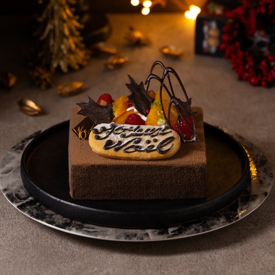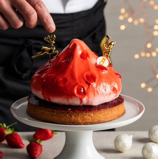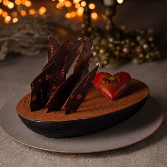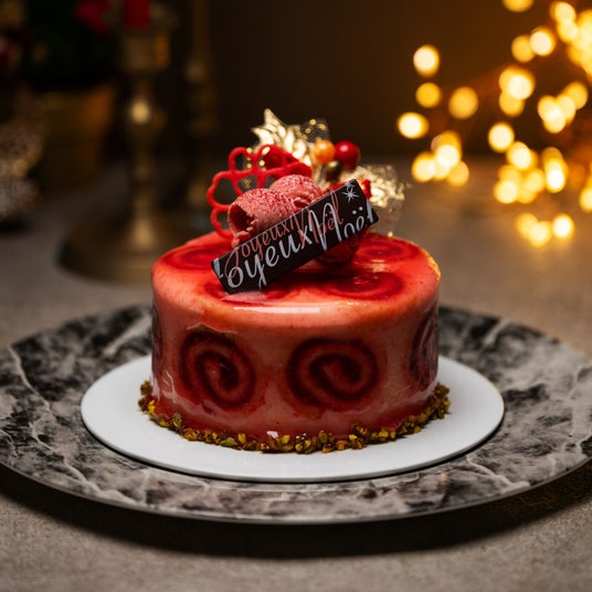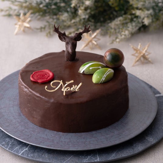ブラジル産カカオのチョコレートをビスキュイ生地と滑らかなクリームに仕立て、ピエモンテ産IGPヘーゼルナッツを贅沢に使用したジャンドゥーヤのクランチを混ぜ込みました。フレッシュな食感に焚き上げたラズベリーのジャムと香り豊かなヴァニラとラズベリーのシロップを染み込ませ、様々なテクスチャーと香りが何層にも重なり表情豊かなクリスマスケーキです。
