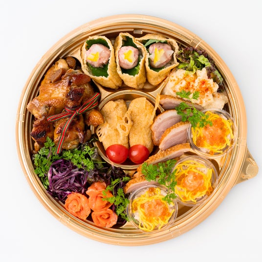 クリスマスにぴったりなローストチキンやスモークサーモンといった食材に加え、トナカイをモチーフにしたいなりやとろたくのいなり、カップ寿司を盛り込んだむろやらしいオードブルです。