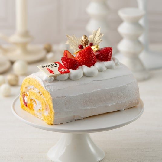 木イチゴジャムをうず巻状にした生地を前面に貼り付けた、フランス伝統のケーキをクリスマス風に仕上げました。
