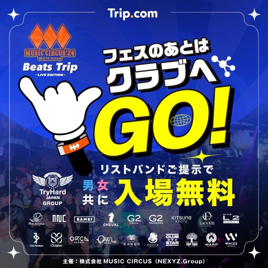 MUSIC CIRCUSのリストバンドを、対象ナイトクラブのエントランスにてご提示で、なんと入場料無料!フェスの余韻に浸りながらお得にお楽しみいただけます。