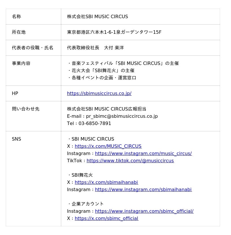 株式会社SBI MUSIC CIRCUSは、「エンタテインメントの力で、世界一笑顔を届ける」をミッションに掲げ、国内最大級の音楽フェスティバル「SBI MUSIC CIRCUS」や、関西最大級の花火大会「SBI舞花火」などを手掛けています。