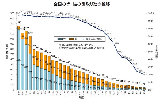 一方で過去20年で引き取り数も10分の1まで減少している 一方で、単身高齢者の増加に伴い、健康上・経済上の理由で飼育継続が困難となり、ペットを手放さざるを得ないケースが増加しています。行き場を失った猫たちは民間の保護施設へと流れ込み、保護依頼の件数は年々増加しています。こうした状況の中、民間団体だけの力では対応に限界があると強く感じています。