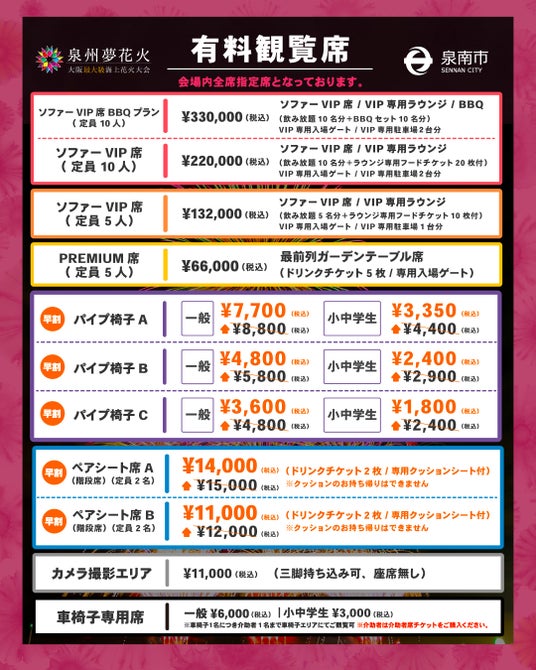 昨年の開催までカメラ撮影席を除く有料観覧席が全て自由席となっておりましたが、本年の開催より全席指定席で販売することになりました。 有料観覧席チケット販売サイト:https://w.pia.jp/t/senshuhanabi/ ■注意事項 泉州夢花火は有料エリアからのみ最高の視聴覚体験が可能な演出となっており、花火の美しさと迫力を最大限にお楽しみいただけます。安全運営を実現すべく、側面や後方からのご観覧は制限いたしますので予めご了承ください。 ご入場いただく皆様に、特別な場所で最高の花火ショーをお楽しみ頂けるよう全力で努めて参りますので、ご理解とご協力を賜りますようお願い申し上げます。 ※団体様をはじめ、場合によっては左右ではなく前後の並びになる可能性もございます。予めご了承くださいませ。■今年も早割がお得!