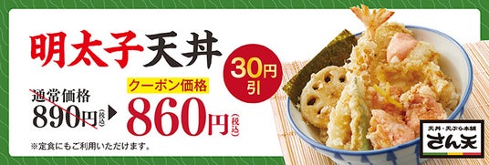 「天丼・天ぷら本舗 さん天」公式アプリでは、販売期間中に使える「明太子天丼(定食)30円引きクーポン」を配信いたします。会員の方限定でご利用いただけるクーポンですので、この機会にぜひ「天丼・天ぷら本舗 さん天」公式アプリをダウンロード&会員登録ください。