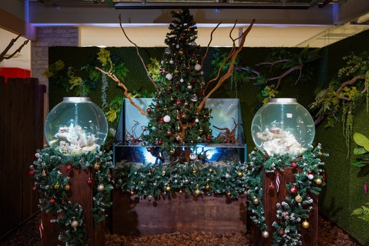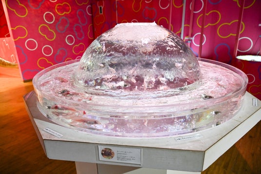 可愛らしい見た目をしたウーパールーパーをメインに、半球のアクアリウムの中に、ぷるぷるを感じられる熱帯魚たちを混泳させ、可愛い生き物の惑星をイメージしています。