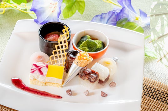スイーツは甘みと酸味のバランスが取れた「日向夏ケーキ」や赤ちゃんのほっぺたのように柔らかくもちもちとした食感がたまらない「はっさくと苺のこんにゃく餅」など、夏ならではの涼やかなスイーツをご提供いたします。
