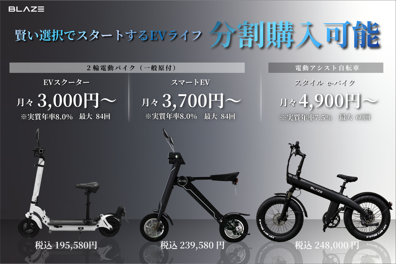 株式会社ブレイズ(愛知県名古屋市、代表取締役:市川秀幸、以下ブレイズ)は、主力3製品の電動アシスト自転車「スタイル e-バイク」、2輪電動バイク「スマートEV」・「EVスクーター」において、導入しやすい分割払いプランをご案内しています。 通勤・通学や買い物、最寄り駅までのアクセスなど、“毎日の移動を軽やかにする”選択肢を、手に届く価格でご提供いたします。