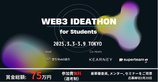 一般社団法人学生web3連合(所在地:東京都渋谷区、代表理事:小川椋徹・内山優太、以下学生web3連合)は、コーホスト・パートナーであるA.T. カーニー株式会社とSuperteam Japan(※)とともに、2025年3月3日(月)から3月9日(日)まで都内で学生向けのWeb3アイディアソン「WEB3 IDEATHON for Students」を開催します。