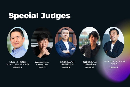最終日のPITCH DAYでは、株式会社HashPort 代表取締役CEOの吉田世博氏、株式会社CoinPost 代表取締役CEOの各務貴仁氏、Superteam Japan Country Leadの大木悠氏、A.T. カーニー株式会社 スペシャリスト・プリンシパルの松岡洋平氏といった豪華審査員が評価します。