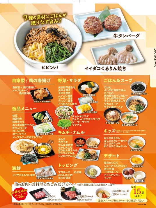 おなかいっぱい楽しめるメニュー人気の「ファミリーカルビ」や「ファミリーロース」などのお肉やサイドメニューもしっかり楽しめます。もちろん安楽亭のおいしいごはんで「オンザライス」もお好きなだけどうぞ。