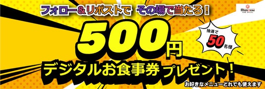 宮本むなしでご利用いただける 500円分のデジタルお食事券を抽選で 50 名様にプレゼント。