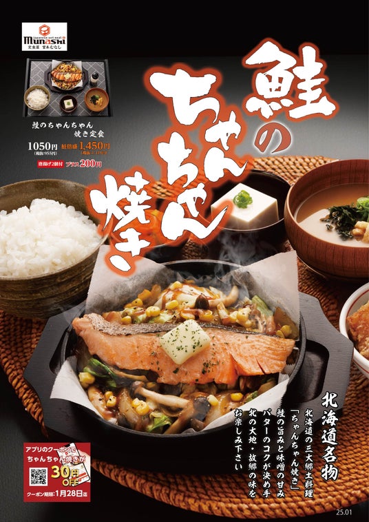 M&Sフードサービス株式会社(本社:大阪府大阪市、代表取締役社長:夏井 克典)が運営する定食チェーン「定食屋 宮本むなし」では、北海道の名物料理「鮭のちゃんちゃん焼き定食」を2025年1月15日より期間限定で販売いたします。