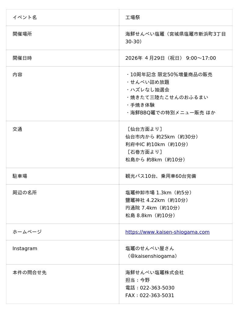 「海鮮せんべい塩竈」(所在地:宮城県塩竈市、代表取締役:杉浦敏夫)は、開店10周年を記念した、「工場祭」を2026年4月29日(水・祝)に開催いたします。