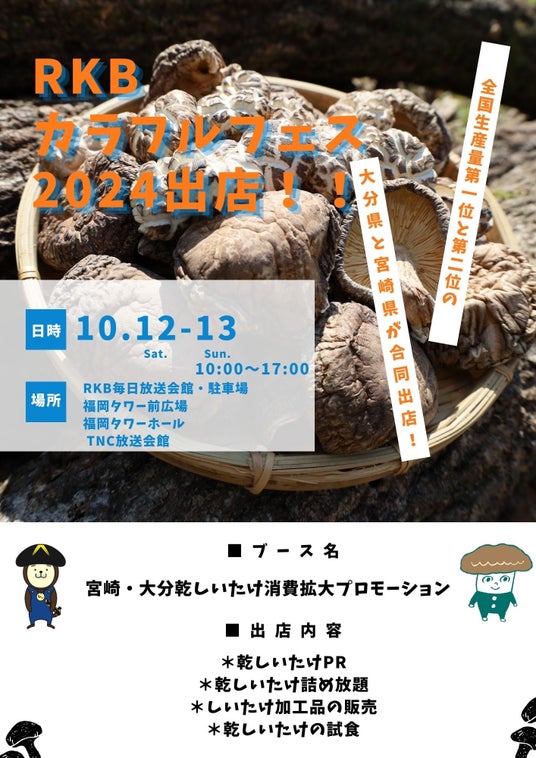 乾しいたけ生産量 全国第1位の大分県と第2位の宮崎県がタッグを組んで、福岡県福岡市で開催される「RKBカラフルフェス2024」において乾しいたけの魅力を発信するPRブースを出店します。