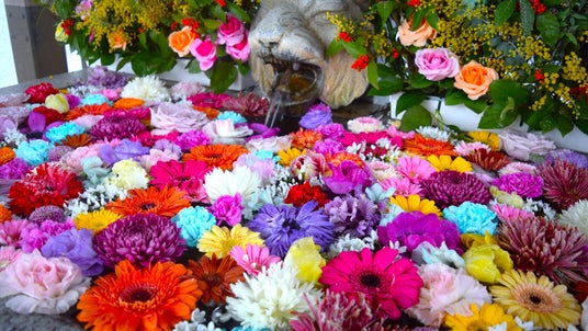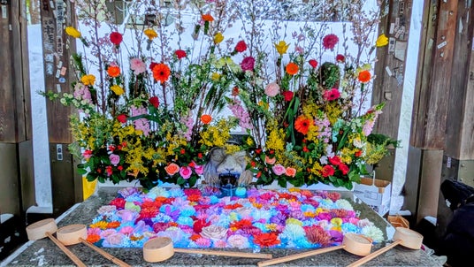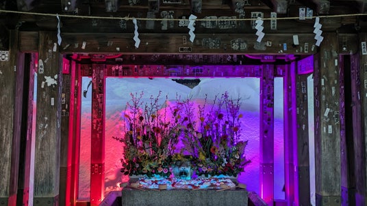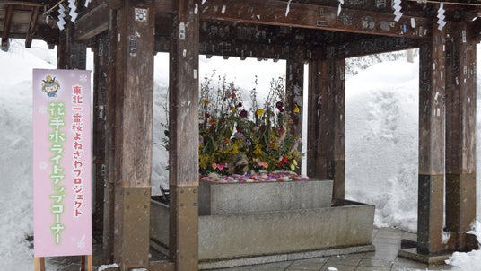 「啓翁桜」はもちろんのこと、色とりどりの花と光が散りばめられた手水場は、きびしい寒さの中、上杉神社へお参りに来られた方々をおもてなしする美しいスポットへと姿を変えました。
