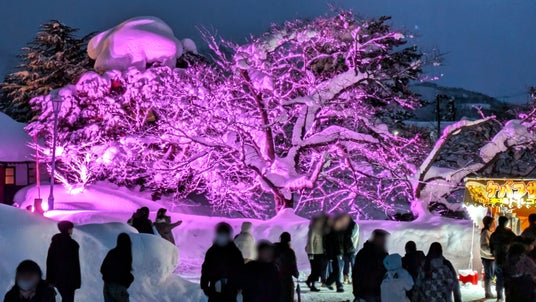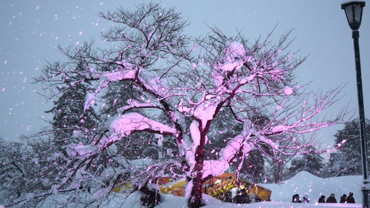 大雪による交通機関の乱れがあったなか「上杉雪灯篭まつり」の伝統を、次世代へ受け継ぐためプロジェクトを敢行。美しくライトアップされた“雪の桜”を会場内に咲かせました。