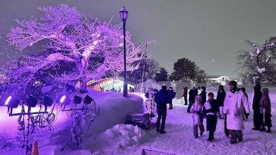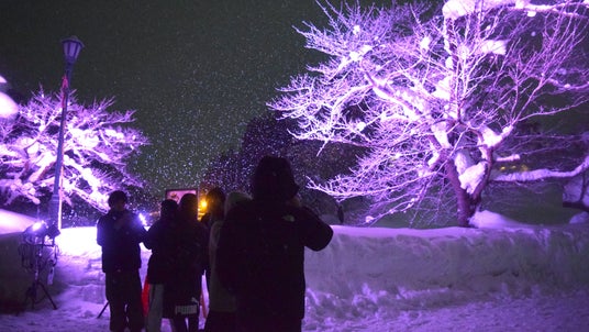 大雪が降り積もる中でのライトアップとなりましたが、ピンク色に照らされた桜の木々と雪が、まるで満開に咲き誇った桜のように、美しい姿となりました。風に舞う雪もまるで桜吹雪のよう。足を止めて、写真を撮影する方々の姿を多く目にすることができました。