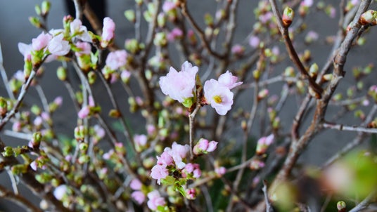 メッセージボードの横には、冬のうちから花を咲かせる桜として知られる「啓翁桜」を展示。みなさんの願いごとで桜の花をひとつひとつ咲かせていただきつつ、美しい啓翁桜の姿を見て、春を待ちわびる気持ちをご共感いただけるスペースといたしました。