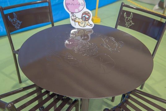 テーブル天板は、関市板取の「名も無き池」(通称モネの池)に咲く睡蓮を椅子背板には関市のイメージキャラクター「関*はもみん」をデザイン