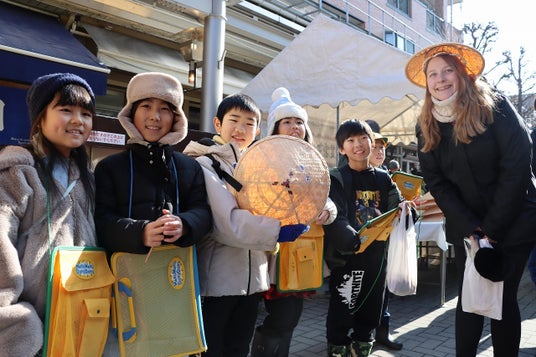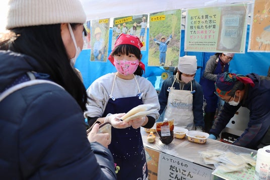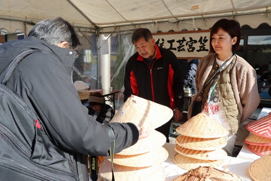 岩滝小学校の3人の児童は、学校近くの棚田で育てた新米を多くの人に味わってもらおうと、保護者が準備したおでんの購入者に精米をプレゼントしました。また、宮小学校の児童は「宮笠」の店舗に立ち、「夏でも冬でも使えます」「色も模様も色々あります」と商品の良さを大きな声でPRしました。